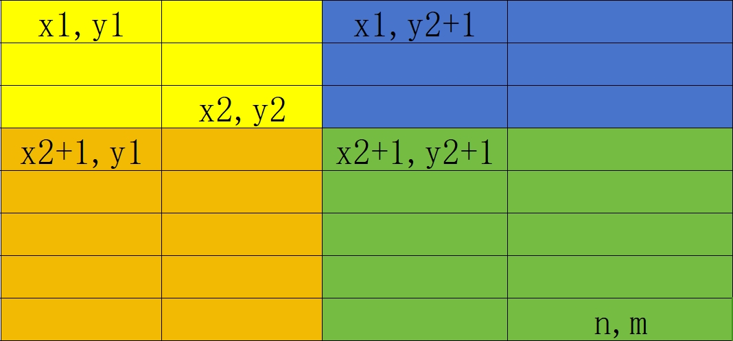 对于一次查询 $(x_1,y_1)$ 到 $(x_2,y_2)$ 范围内的子矩阵和,按下式计算: