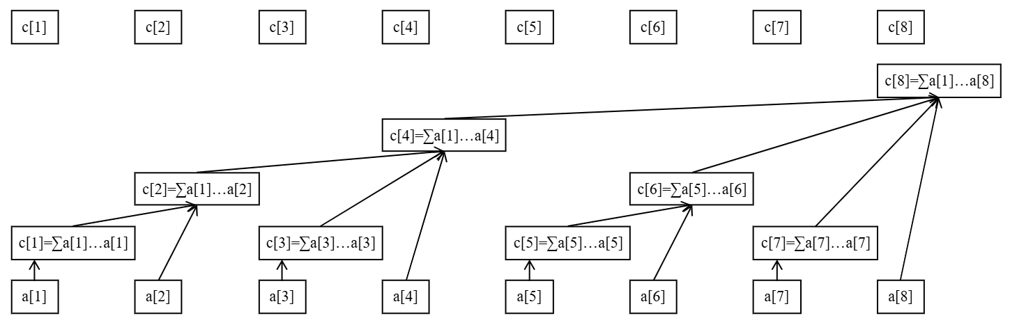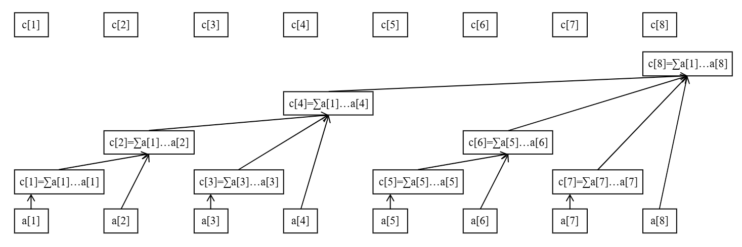 最下面的八个方块代表原始数据数组 $a$。上面参差不齐的方块(与最上面的八个方块是同一个数组)代表数组 $a$ 的上级——$c$ 数组。